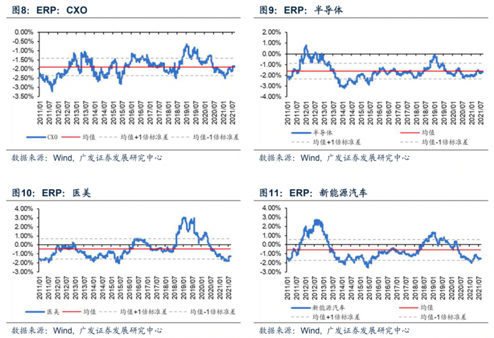 我们再从ERP角度观察市场对各新兴行业的风险偏好,通常ERP下降代表行业估值上行。从近期趋势看,CXO与半导体行业的ERP相对平稳,略有上升趋势,而医美和新能源汽车行业的ERP下行趋势明显。