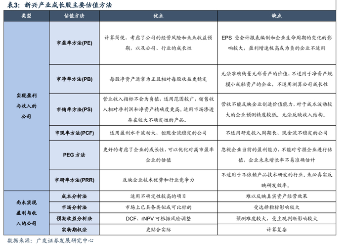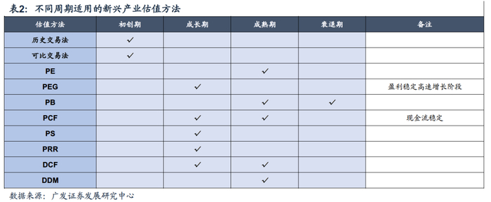由于新兴产业在不同生命周期阶段具有不同的财务特征,因此适用的估值方法也有所不同。