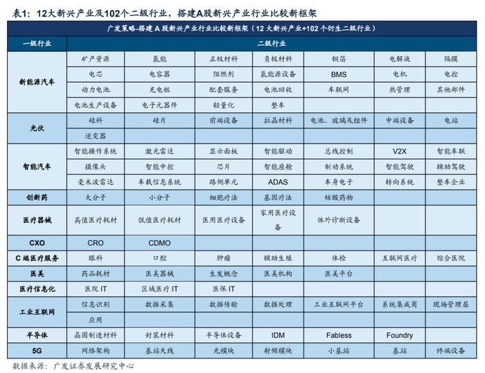 12大新兴产业,102个细分行业,构建A股新兴产业行业比较新框架。我们在18年的《进化论》系列报告中指出,A股生态格局发生巨变,对于全新生态的思考与理解更为重要,应该拥抱新生态、融入新均衡、打造新方法。而19年以来我们在《金融供给侧慢牛》系列报告中指出,金融供给侧改革的开启将逐步构建新经济“宽信用”的供需机制、让市场在资源配置中起决定性作用。相应而来的,则是A股市场迎来越来越多的新兴产业公司,传统行业分类已无法完全适应。A股新兴产业的行业比较需要新方法。我们以产业发展空间巨大、已初步形成产业基础、且在A股已具备一定数量标的为标准筛选出12大新兴产业,并衍生出102个二级行业,在此基础上设立《策话新兴产业系列》报告,从资金、估值、业绩、景气等多元角度对新兴产业搭建数据库,并将就估值方法、投资方法等展开探讨,构建A股新兴产业行业比较新框架。