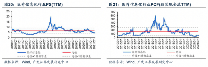 从市销率看,2021年8月医疗信息化行业PS(TTM)为4.39X,较上月环比下降7.14%,接近历史最低值;从市现率看,行业PCF(经营现金流TTM)为59.93X,环比下降2.99%,历史分位数25%。综合来看,医疗信息化行业估值已达到较低水平。