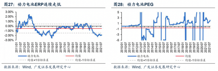 动力电池是新能源汽车的核心细分行业,从ERP角度,市场对动力电池行业要求的风险溢价连续走低,2021年8月的ERP为-1.92%,较上月环比下降5.73%,处于历史低位水平,而从PEG角度,当期行业PEG为1.82,与行业市场表现基本匹配,未达到严重高估的2以上区间。