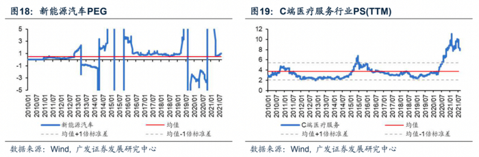 新能源汽车的ERP为-1.59%,虽低于历史均值,但仍在一倍标准差范围内,可以认为其风险溢价下行并不过度,反映其估值水平大约在中等偏上位置。但是包括ERP在内的以历史指标进行估值的方法并不能很好地衡量其行业是否真的存在泡沫。如今,汽车电动化大势所趋,“碳中和”自上而下对新能源汽车全产业链的市场规模驱动作用明显,可以预见新能源汽车行业未来盈利有望持续增长。显然,PEG能够更好反映新能源汽车估值水平。截止2021年8月,新能源汽车的PEG估值为0.88,历史分位数75%,估值较为合理,不存在明显高估。