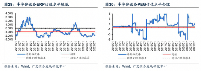 从ERP角度,半导体设备行业风险溢价近期在低位波动,2021年8月的ERP为-1.78%,较上月环比下降4.86%;从PEG角度,半导体设备在2021年8月的PEG为0.85,近几月均在1以下,未达到高估水位。