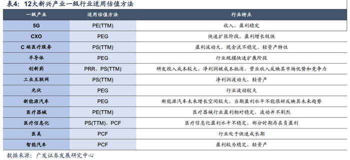 根据12大新兴产业链基本特征,在结合各行业估值方法分析后,我们针对每个一级新兴行业提出更为适用的“新”估值方法。