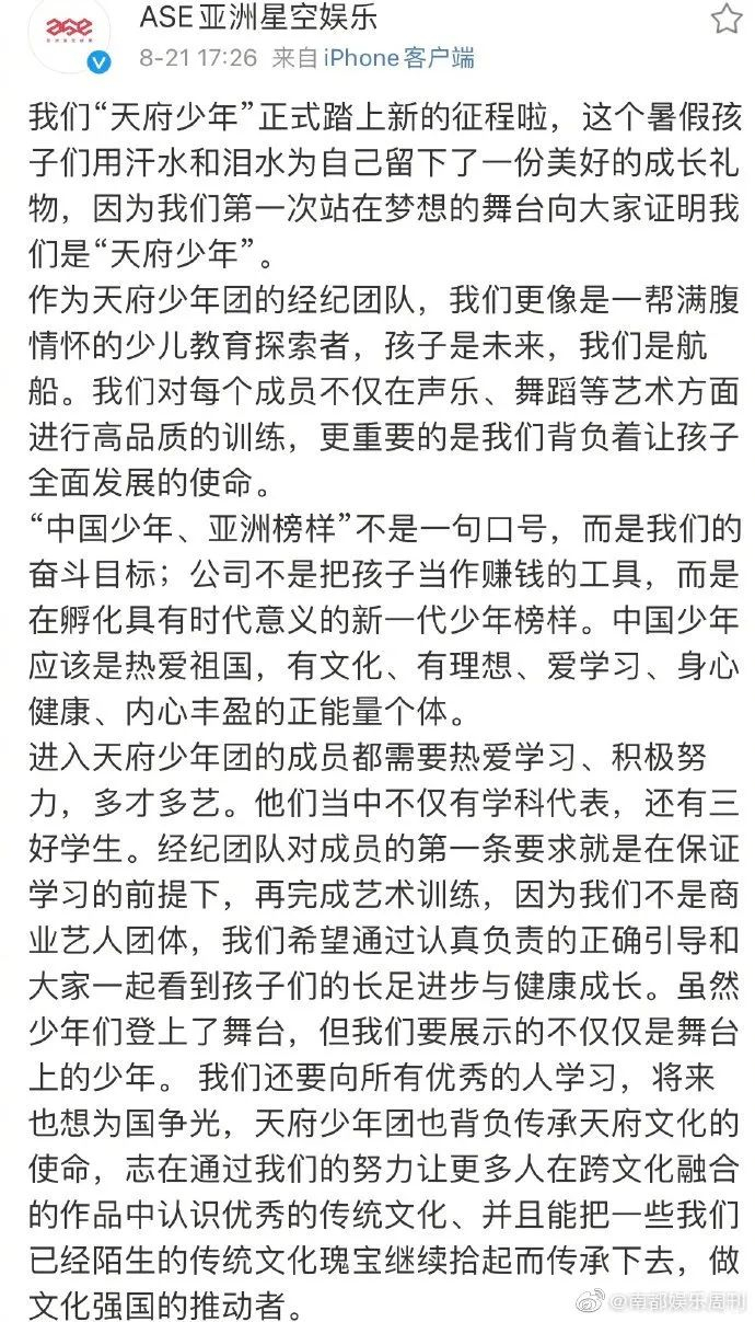 8月21日,“天府少年团”所属公司发文回应质疑,强调公司不是把孩子当作赚钱的工具,而是在孵化具有时代意义的新一代少年榜样。 他们当中不仅有学科代表,还有三好学生。对成员的第一条要求就是在保证学习的前提下,再完成艺术训练。