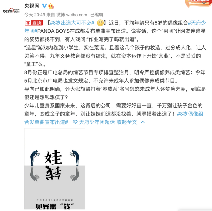 当晚,央视网也发表评论称,少年儿童身系国家未来,这背后的公司,需要好好查一查,千万别让孩子金色的童年,变成金子的童年, 别让娃娃们道都没找着,就寻摸着出道了!