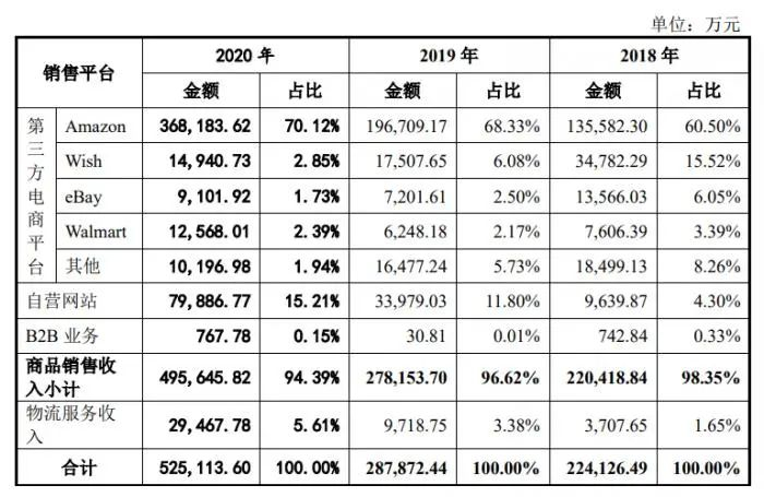 同在创业板冲刺IPO的赛维时代公司则主要依靠 Amazon、Wish、eBay、Walmart 等国际知名第三方电商平台进行产品销售。2018年至2020年报告期各期,其在亚马逊平台实现的销售收入分别为 13.56亿元、19.67亿元和36.82亿元,占其各期主营收入的比例分别为 60.50%、68.33%和70.12%。