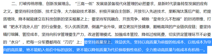 很多人关注的是原材料采购环节要用竞价采购,大批量阶梯降价,这一点的确值得关注,不过还有一点也需要注意,倡议书提到“要坚持质量至上、效益优先,坚持以高质量为前提的低成本、以低成本为导向的高质量,绝不能陷入低价中标的误区,更不能以降低质量为代价换取假性低价,全力推动高质量与低成本有机统一。”