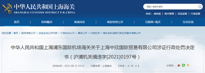 原标题:关于上海中欣国际贸易有限公司涉证行政处罚决定书(沪浦机关缉违字[2021]0197号)