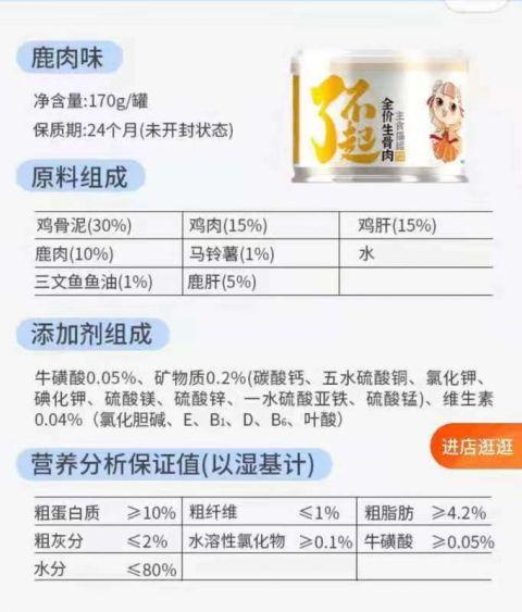 福西西解释,玄机藏在配料表里:该进口品牌鹿肉罐头配料表前7位均为鹿肉、鹿肉汤、鹿肝、鹿肺等鹿肉成分,而在该国产品牌的鹿肉罐原料组成中,鹿肉和鹿肝成分仅占15%,其余的鸡骨泥、鸡肉、鸡肝成分占60%。“(国产品牌)咋好意思叫自己鹿肉罐头的,就单纯是拿鹿肉搞个噱头而已,”福西西气愤道:“看似便宜大碗,实则性价比没想象的那么高。”