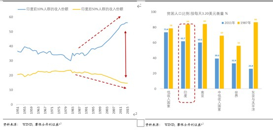 中空化与二元化的不断发酵,导致印度贫富差距问题也不断扩大。截至2015年,印度前10%人群的收入份额达到56.1%,但后50%人群的收入份额仅占14.7%(图8)。同时,印度的贫困人口比例在2011年下降至62%,但仍大幅高于世界平均水平33%(图9)。而按照世界银行标准,印度的贫困率(每天生活费不足3.20美元的人口所占总人口的百分比)更是高达61.7%。失业率和贫困人口的增长对经济运行形成了阻力,中空化与二元化也导致印度的财富不断向高低两端聚集,贫穷的人难以通过劳动实现阶级跃升,富有的人则占据了越来越多的资本与资源。贫富分化的加剧不仅经济结构的优化难以推进,复杂的社会矛盾也导致国家产业政策的落地难以实现预期效果。