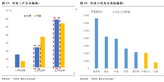 整体来看,印度不仅缺乏工业化资本积累,劳动力素质也未能跟上全球工业化发展的脚步,在资本、技术与劳动力的缺失压力不断发酵的情况下,印度本就陷入瓶颈的经济增长难以获得充分的发展空间,前期较高的速经济增速存在隐患。而中国不仅具有充足的资本积累、持续的技术提升以及相对稳定的就业结构,在基建方面的优势也是印度短期内不可取代的。因此,我们认为印度未来并不具备承维持经济高速增长、成为“第二个中国”的能力。