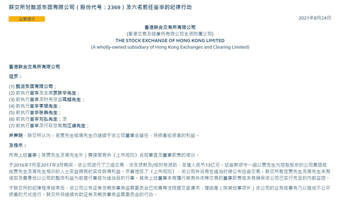 中新经纬客户端8月24日电 24日,香港交易所官网发布纪律行动声明,酷派集团及贾跃亭、蒋超等六名前任董事被谴责。声明同时称,若贾跃亭或蒋超仍继续于该公司董事会留任,将损害投资者的利益。