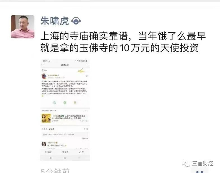 随后金沙江创投董事总经理朱啸虎转发何河微博,对何河文中寺庙策划的“纾困方案”给予肯定,还举例称饿了么最早就是拿的玉佛寺10万元天使投资。