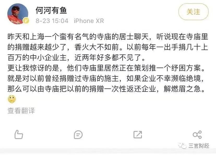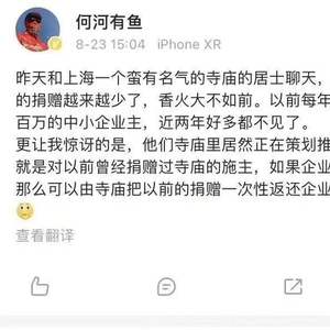 8月23日,必扬投资总经理何河发微博称,如今寺庙香火大不如前,很多以前一出手就捐几十甚至上百万的中小企业主,近年来都不见了。