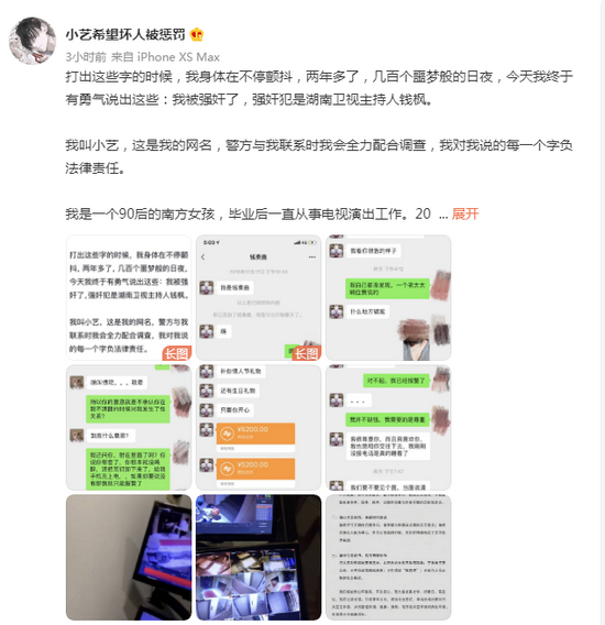据爆料网友讲述,她是一个90后的南方女孩,毕业后一直从事电视演出工作。2018年,她受邀参加了湖南电视台天天向上节目组一期录制工作,整个彩排录制中我都没有跟主持人钱枫有过接触。节目录制完的当天晚上,她回到节目组安排的酒店,收到了节目组工作人员的信息,之后加上了主持人钱枫的微信。