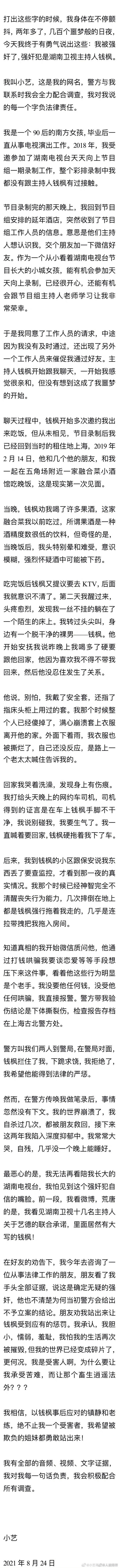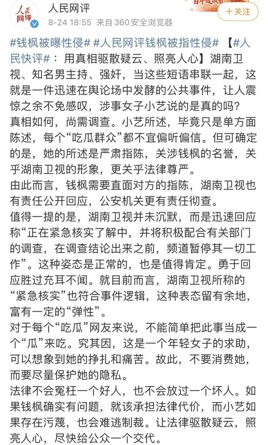 8月24日下午,湖南卫视主持人钱枫被女网友控诉性侵,随后,事件相关的话题轮番登上热搜第一。并在微博热搜榜占据两个位置。