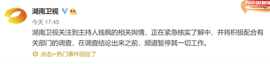 湖南卫视官方对此事进行了回应。据湖南卫视官方微博消息,湖南卫视关注到主持人钱枫的相关舆情,正在紧急核实了解中,并将积极配合有关部门的调查,在调查结论出来之前,频道暂停其一切工作。