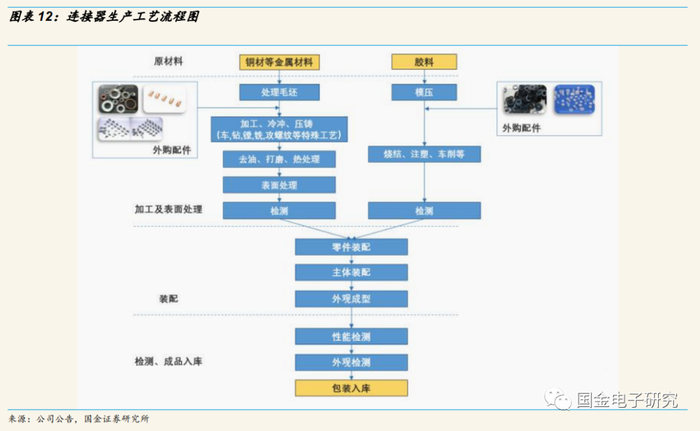 ◾ 汽车连接器属于中高端连接器产品,具有较高的技术和工艺壁垒。连接器产品本身的工艺要求高、技术含量高、品质要求高,这需要生产厂家必须具备较强的行业经验、研发能力、工艺能力和品质保证能力,其研发设计能力与生产加工工艺高度匹配,以适应产品更新迭代的技术创新和工艺创新。连接器的专利壁垒非常多,后进者绕开专利也需要长时间的技术积累和投入,门槛较高。从连接器产品的生产工艺流程来看,主要工序包括:精密注塑、精密冲压、压铸、机械加工、表面处理、组装和测试,涉及到材料技术、结构设计、仿真技术、微波技术、表面处理技术、模具开发技术、注塑工艺技术、冲压工艺技术等。
