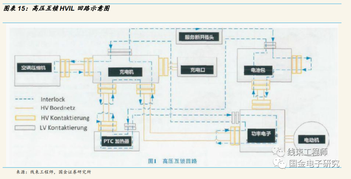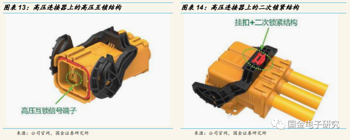 ◾ 高压连接器的壁垒在于如何适应其高电压、大电流的工作环境并保证汽车电子系统的安全性。1)从设计端来讲,核心在于如何解决热管理的温升问题,以及高压防护。温升的技术难点在于接触电阻和材料选择,需要满足接触电阻低、工作时温升小的要求,避免温度过高导致连接器发生烧蚀。高压防护通常通过高压互锁和二级锁紧结构实现,其中,高压互锁(HVIL),是通过低压信号确认整个高压电气系统的完整性,确保整车所有高压部件和线束接插件全部安装到位,无短路或断路的一种安全设计方案。只有当高压互锁回路形成了一个完整闭环时,BMS认为车辆的高压部件状态正常,才会允许接通高压电源;一旦由于意外或碰撞因素导致回路遭到断开,则会触发HVIL的断开信号,BMS将在毫秒级时间内断开高压电,以降低高压对人体伤害的风险,确保用户安全。二次锁紧是确保一级锁止后进行二次有效保护,保证汽车长期处于动态工作环境的抗振动冲击的良好机械性能。2)从工艺端来讲,高压连接器的连接技术分为压接连接和超声波焊接,压接连接是通过物理压缩实现绞线、导体套筒等的连接,实际压接过程中会产生应变效应,即导体受机械变形时电阻值发生变化;超声波焊接是利用高频振动波使物体表面相互摩擦而形成分子层之间的熔合,有效克服了电阻焊接时所产生的飞溅、氧化现象,具有高成本效应。目前,超声波焊接是一种理想的金属焊接技术,但如何保证电性能和良品率对很多厂商来说仍是一大挑战。