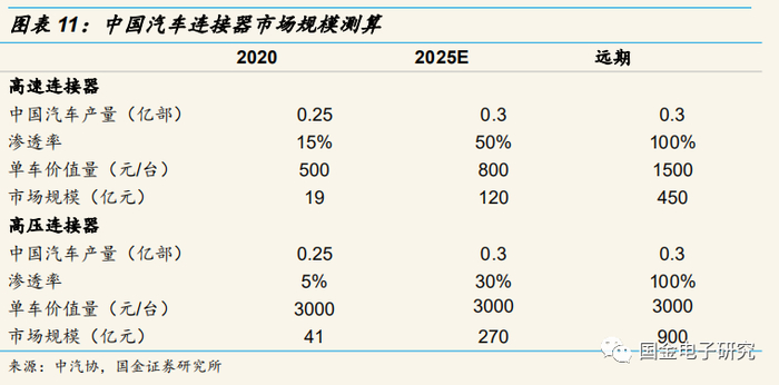 ◾ 预计2025年中国高速连接器、高压连接器的市场规模分别将达到120亿元和270亿元,预计远期中国高速连接器、高压连接器市场规模达450、900亿元。1)根据中汽协预估,到2025年中国汽车销量有望达到3000万辆。2)高速连接器的单车价值量在500-1000元,预计2020、2025年单车高速连接器价值量在500元、800元,远期到1500元,预计2020、2025年智能驾驶渗透率在15%、50%。预计高速连接器2020年市场为19亿元、2025年市场为120亿元、远期市场达450亿元。3)高压连接器单车价值量在3000元,预计2020、2025年新能源车渗透率为5%、30%,预计高压连接器2020年市场为41亿元、2025年市场为270亿元、远期市场达900亿元。