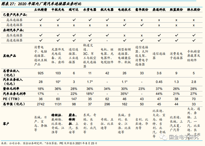 ◾ 意华股份:公司以通讯连接器为核心,延伸发展汽车连接器领域。2020年公司收入为32.68亿元,其他连接器及组件收入4.61亿元。新能源汽车业务紧密围绕头部Tier 1厂商在BMS、车载高频高速、T-box等领域与客户定制开发,并自主研发下一代核心产品,目前主要客户有吉利、比亚迪、华为等,现处于小批量和送样阶段,销售占比不大。
