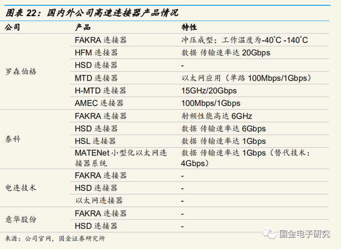 ◾ 在高速连接器方面,罗森伯格、泰科在国际上处于领先地位,国内厂商相对落后较多,有望借国内新能源强劲势头和持续不断的研发投入追赶国外厂商。1)罗森伯格作为资深设计制造车载射频连接器的国际知名企业,深度挖掘分析市场需求,对传统FAKRA连接器进行升级,研发出新一代HFM(High-Speed FAKRA-Mini)连接器,频率高达15GHz,可实现高达20Gbps的高速率传输,体积更小,相比传统FKARA连接器节约了高达80%的空间,实现成本优化,走在国际前列。2)电连技术依托射频连接器技术,前瞻布局汽车高速高频连接器,主要研发设计FAKRA、HSD和以太网连接器,已实现批量生产,成功进入吉利、长城、比亚迪、长安、奇瑞等国内主要新能源汽车厂商供应链,取得市场的广泛认可,并与华为达成深度合作,提供以太网连接器产品的定制服务,2020年营收突破1亿。3)意华股份以通讯连接器为核心,延伸发展汽车连接器领域,新能源汽车业务紧密围绕头部Tier 1厂商在BMS、车载高频高速、T-box等领域与客户定制开发,并自主研发下一代核心产品,目前主要客户有吉利、比亚迪、华为等,现处于小批量和送样阶段,销售占比不大。