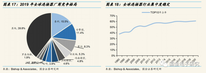 ◾连接器行业的国外垄断格局明显。根据Bishop & Associates统计,2019年全球销售额排名前10的连接器公司分别为泰科、安费诺、莫仕、安波福(Aptiv)、鸿海精密、立讯精密、矢崎、JAE、JST、罗森伯格,CR3达35.2%,CR10 达60.2%,以欧美、日本厂商为主,仅有一家中国大陆企业进入TOP10。2020年,立讯精密上升至第4位,CR10为60.8%。