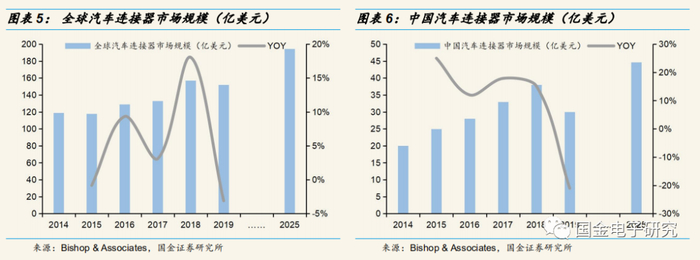 ◾ 汽车连接器占全球连接器市场比重达23.7%,是连接器第一大应用领域。据Bishop & Associates,2019年全球汽车连接器市场规模达152亿美元(折合人民币988亿元),2014-2019年CAGR为4%,高于同期全球增速。2019年中国汽车连接器市场规模达30亿美元(折合人民币195亿元),2014-2019年CAGR为8%。近年来,汽车产业经历着技术和商业模式的双重变更、融合和重建,电动化和智能化的变革趋势推动汽车产业加速发展,新能源汽车更加契合未来自动驾驶、车联网的发展趋势,并且凭借其节能和环保的特点契合了当今国际社会对于能源紧缺和环境污染问题的关注。随着新能源汽车渗透率的提高,以及汽车电子化、智能化程度的不断提升,连接器作为汽车制造中的必需品,市场需求亦呈现上升趋势。