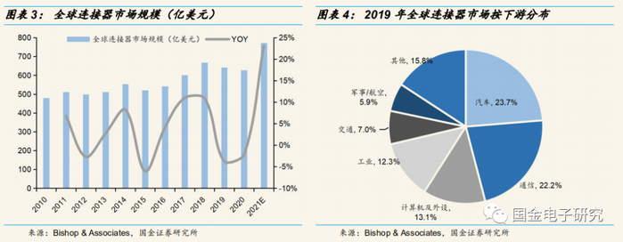 ◾ 近年来全球连接器市场呈现稳步增长趋势。据Bishop & Associates,全球连接器市场规模从2010年的479.39亿美元增长至2020年的627.27亿美元,期间CAGR为2.7%。由于需求反弹、订单数激增,预计2021年全球连接器销售额将达到771.7亿美元,同比增长23.0%。随着下游终端市场的规模增长与技术迭代更新,将推动未来连接器市场规模持续扩大,预计2023年全球连接器市场规模将超过900亿美元。