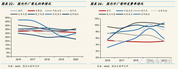 ◾ 汽车连接器行业国外厂商占据领先优势地位,国内厂商在持续追赶中。根据Bishop & Associates统计,2019年全球汽车连接器厂商TOP10以美、日企业为主。泰科、矢崎、安波福三巨头市占率之和达66.8%。相比于国外知名连接器企业,国内连接器生产厂商起步较晚,发展起点相对较低,前期技术储备不足,但随着中国制造业的发展,以国内新能源造车新势力崛起为契机,国内汽车连接器厂商如中航光电、瑞可达、永贵电器、航天电器、电连技术等快速崛起,凭借长期的研发投入形成了较强的工艺控制与成本控制能力,借力国产车厂,贴近客户且快速响应,快速形成了规模优势,在制造成本、产品品质上已经具有较强的市场竞争力。