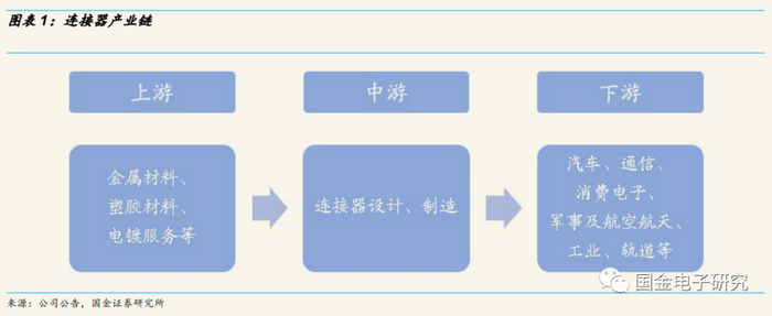 ◾ 连接器是电子系统设备之间电流或信号传输与交换的电子部件。作为节点,通过独立或与线缆一起,为器件、组件、设备、子系统之间传输电流或信号,并且保持各系统之间不发生信号失真和能量损失的变化,是构成整个完整系统连接所必须的基础元件。从产业链来看,上游包括金属材料、塑胶材料、同轴线缆等原材料,以及机械加工设备、电镀加工设备、测试设备、装配设备等设备供应商;下游覆盖汽车、通信、消费电子、军事、工业、航空航天、轨道等多领域。