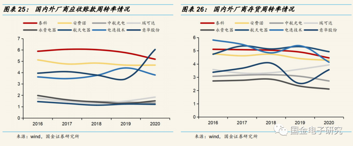 ◾ 选取国外头部厂商泰科、安费诺以及国内厂商中航光电、瑞可达、永贵电器、航天电器、电连技术、意华股份进行财务对比。1)从整体盈利水平来看,连接器厂商的毛利率基本稳定在30%-35%。电连技术毛利在2017-2019年期间波动较大,主要系智能手机行业进入存量时代,行业竞争加剧,ASP下跌;意华股份毛利水平在25%-30%,2020年下滑至23%,系其营收占比近40%的太阳能支架业务盈利水平较低,仅为16%。2)从研发费率来看,中航光电、永贵电器、航天电器、电连技术的研发费率在10%左右,属于行业较高水平。3)从应收账款周转率来看,尽管泰科、安费诺经营规模相对较大,其应收账款的回收速度仍保持在较高水平,海外厂商整体应收账款账期较短。4)从存货周转率来看,泰科、安费诺、航天电器、电连技术在存货管理方面水平较高,瑞可达逐年稳步提升。