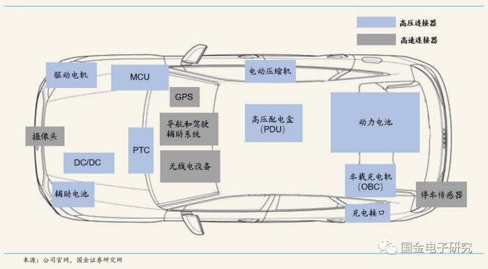 ◾ 高压连接器普遍应用于新能源汽车,一般根据场景不同需要提供60V-380V甚至更高的电压等级传输,以及提供10A-300A甚至更高的电流等级传输。高压连接器主要应用于新能源汽车的电池、PDU(高压配电盒)、OBC(车载充电机)、DC/DC、空调、PTC加热、直/交流充电接口等。