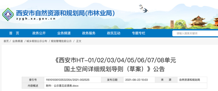 8月23日,西安市自然资源和规划局(市林业局)公布《西安市HT-01/02/03/04/05/06/07/08单元国土空间详细规划导则(草案)》公告(以下简称《公告》)。