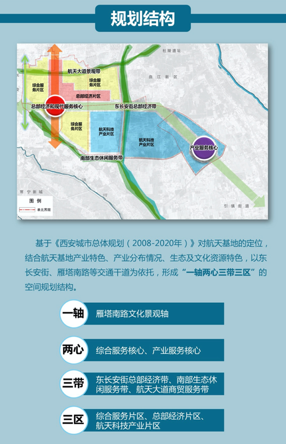 在规划结构上,将以东长安街、雁塔南路等交通干道为依托,形成“一轴两心三带三区”的空间规划结构。
