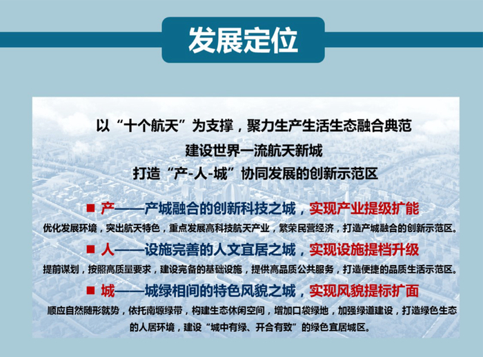 8月23日的《公告》中,再次强调以“十个航天”为支撑,以建设世界一流航天新城为目标,聚力生产生活生态融合典范,打造产—人—城协同发展的创新示范区。