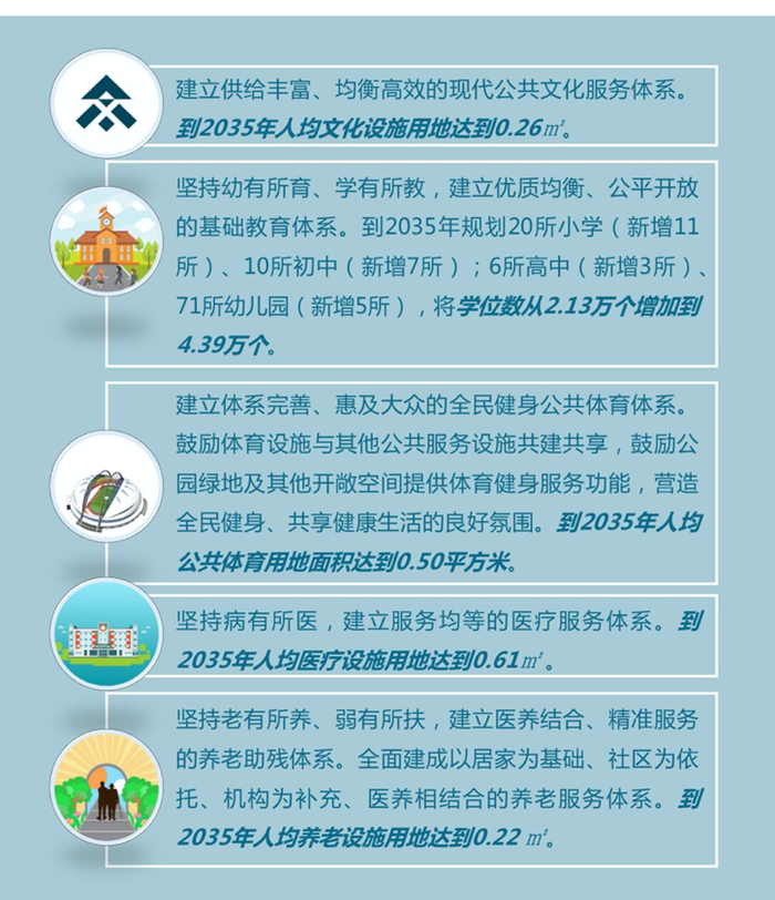 到2035年,人均文化设施用地达到0.26平米,人均公共体育用地面积达到0.50平米。还将构建8大城市公园,人均公共绿地面积达到8.31平米,从而实现300米见绿、500米见园、步行5分钟可达公共绿地愿景。