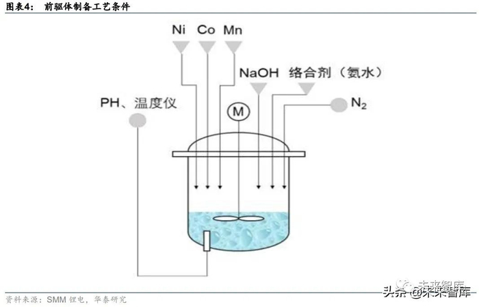前驱体为镍钴锰氧化物,与碳酸锂烧结后可得三元材料(镍钴锰酸锂)。氢氧化物共沉淀法 是目前大规模制备三元前驱体的主流方法。共沉淀法优点在于让多种金属离子在沉淀剂的作用下同步沉淀,得到各组分均一的沉淀物,很大程度上提升了前驱体材料的振实密度,其颗粒表面光滑、粒径分布均一、振实密度高,而且原料在晶格中分布均匀,材料杂相较少。共沉淀法又分为氢氧化物共沉淀法、碳酸盐共沉淀法、草酸盐共沉淀法,其中大规模应用的是氢氧化物共沉淀法,主要制备工艺条件有:氨水浓度、pH 值、反应温度、固含量、反应时间、成分含量、杂质、流量、反应气氛、搅拌强度等。