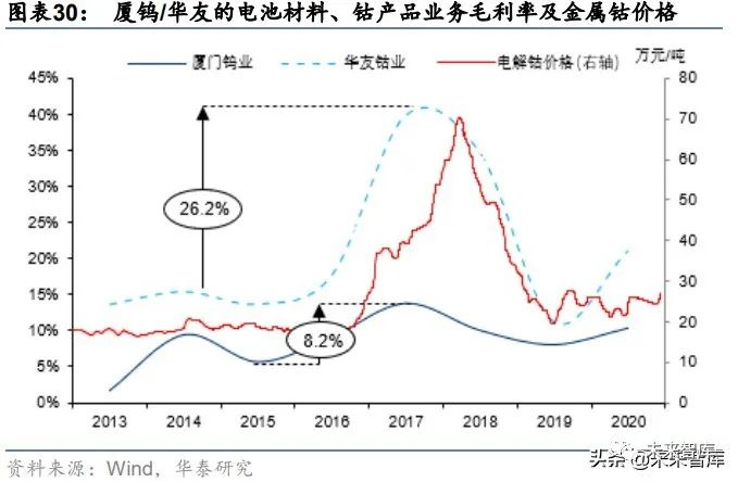 技术型企业的盈利周期性不如资源型企业,但胜在持续性。2013 年至今,技术型企业的盈 利能力波动性显著小于资源型公司,以钴含量较高的钴酸锂和四氧化三钴为例,2016-2018 年间,电解钴价格上涨 289%(从 11.0 万元/吨提升至 43.0 万元/吨),华友钴业的钴产品毛 利率提高了 26%;厦门钨业电池材料毛利率仅提高了 8%。资源型企业的投资机会主要集 中于涨价期,从 2015 年至今,华友钴业股价上涨主要在 2017-2018 年及 2020 上半年,背 后催化剂均是钴价的上行(或预期)。2016-2018 年其钴产品毛利润增加 465%,其股价上 涨 512%。