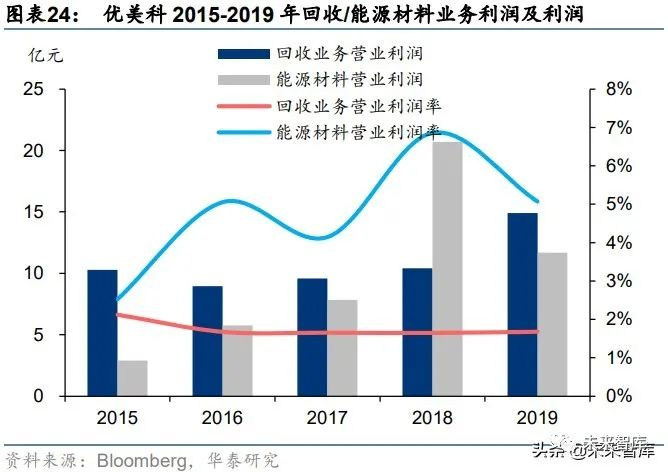 回收业务盈利稳定,能源材料业务盈利波动较大。2015-2019 年优美科回收业务营业利润 维持在 10 亿元左右,利润率保持在 16%左右,能源材料业务营业利润先增后降,利润率波 动较大,保持在 2.5%-6.9%的区间。