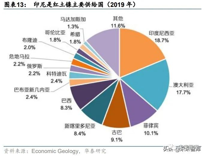 印尼是世界红土镍矿资源最丰富的国家之一。印尼占有世界红土镍矿储量的 10%以上,主要 资源集中在苏拉威西岛,哈马黑拉岛及其附近岛屿。印尼是我国镍进口的主要来源国之一, 根据海关总署数据,2019 年我国自印尼的镍矿砂及精矿进口量占我国总体进口数量的 42.54%。印尼新矿产法规定,从 2020 年 1 月 1 日起印尼政府禁止所有品位的镍矿出口。当 然,从商业角度,在资源产出地对红土镍矿进行冶炼加工也是最经济、合理的资源利用方式。