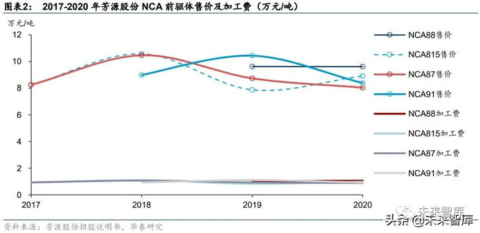 前驱体行业呈现来料加工的特点,客户类型(国外/国内)和产品类型(镍含量越高,加工 费越高)共同决定产品售价。以三元前驱体加工商芳源股份(主要客户为松下-特斯拉体系) 为例,2017-2020H1 其产品售价波动较大,但其加工费则基本恒定。其中 2019 年 NCA91 的海外客户加工费高出国内 66%,其国内 NCA91 的加工费也高出 NCA87 接近 23%。