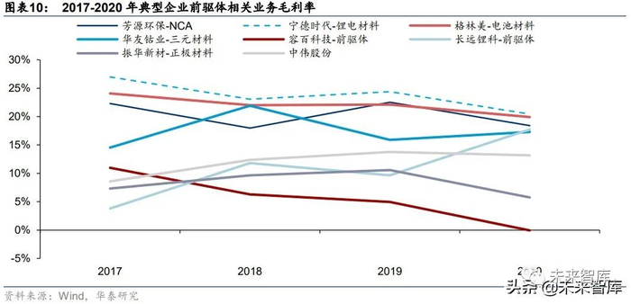 正极材料企业前驱体相关业务毛利率水平总体较低。以 2020 年为例,正极材料企业(容百 科技)的前驱体相关业务毛利率水平为-0.07%,冶炼-前驱体一体化公司(格林美、华友钴 业)的毛利率水平为 19.92%和 17.29%,专业前驱体生产企业(芳源股份、中伟股份)的 毛利率水平为 18.41%和 13.16%,正极材料企业前驱体相关业务毛利率水平显著低于专业 前驱体企业。