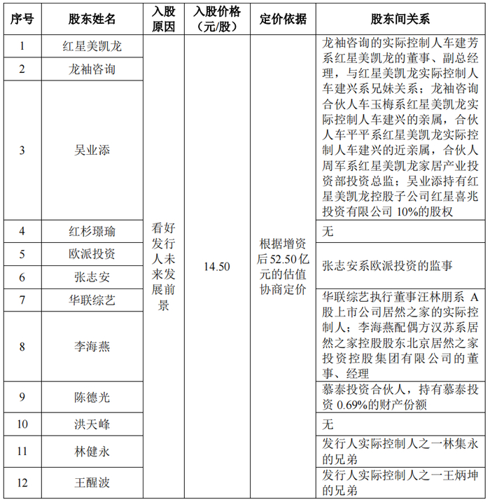 其中,龙袖咨询是红星美凯龙的关联方;华联综艺的实控人汪林朋为居然之家(000785. SZ)实控人;而欧派投资则由欧派家居(603833. SH)全资持股,个人股东张志安亦是欧派投资的监事。