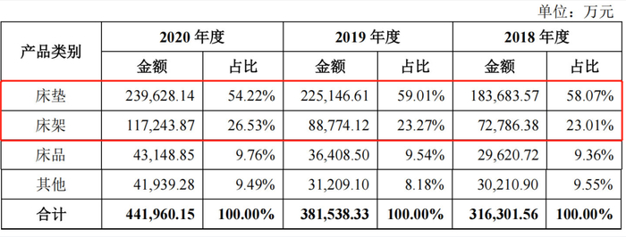 从营收结构看,慕思股份盈利来源较为单一。其中,床垫、床架这两大产品为慕思股份贡献合计超8成的营收。