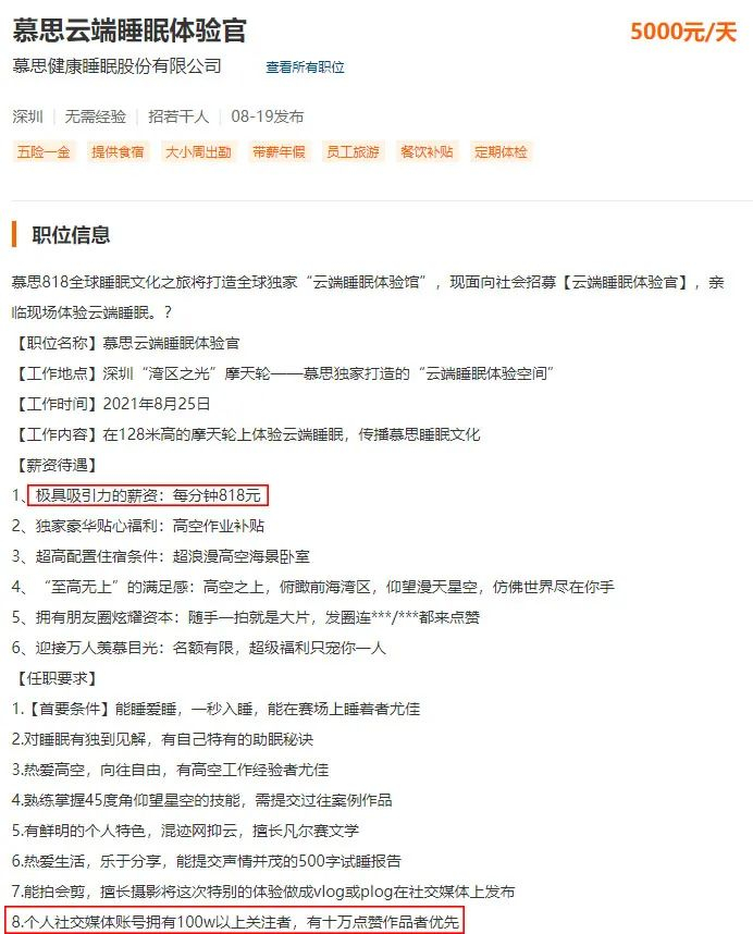 有趣的是,慕思每年还会在各大招聘平台发布“睡眠体验官”的职位信息。乍一看,日新5000,分分钟小一千轻松到手?不免有些心动?但看了任职要求一下悟了,人家是要百万粉以上的大网红来给他们做宣传。有网友表示:“大V看不上,我们够不着。”