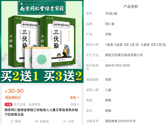 “你仔细看网上售卖的‘三伏贴’,实际包装上并不是这个名字,都是打擦边球。”一家提供“三伏贴”贴牌服务的山东某医疗器械有限公司销售人员向澎湃新闻(www.thepaper.cn)透露,像“穴位贴敷治疗贴”、“肩颈冷敷贴”、 “祛痛冷敷贴”这类产品,无论是属于家庭保健用途的一类医疗器械,还是需要进一步备案或注册的二类医疗器械,外包装上都不会明确标注任何中药成分,“只要标了,国药监那边就批不下来”。
