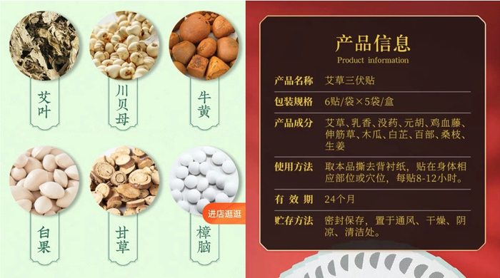 陈云飞看完记者在淘宝上随机看到的3款三伏贴成分配方后,均表示“不合适”。他指出,在“艾叶、川贝母、牛黄、白果、甘草及樟脑”这几味中药构成的配方中,牛黄性凉,而川贝和白果油脂高,易助长湿热,对虚寒类病症适得其反。由艾草、乳香、没药、元胡、鸡血藤、伸筋草、木瓜等组成的另一张配方表中,“鸡血藤”和“木瓜”这两味药材,以根茎为主,主要用于滋阴养血,不宜作为敷贴使用。