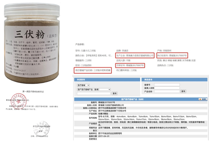根据该商家登记的信息,澎湃新闻记者并未在国家药品监督管理局官网上查询到相关 “医疗器械企业生产/经营企业(许可)”信息。该 “青械备”字号对应的产品名称,为二类医械产品“祛痛冷敷贴”。依照国药监批准,这款“祛痛冷敷贴”由无纺布、胶层、防粘层(聚乙烯薄膜或防粘纸)等部分组成。胶层主要由高分子树脂、薄荷脑、对羟基苯甲酸等组成,并未提及上述 “三伏粉”中生成含有的白芥子、细辛、黄芪等中药成分。